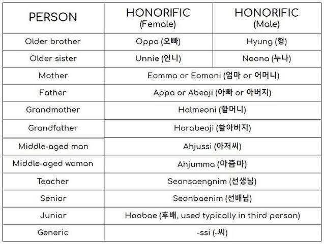 7. you can't say someone older using a name. they use unnie (younger girl to older girl), noona (younger boy to older girl), oppa (younger girl to older boy), hyung (young boy to older boy), ahjusshi (to someone over 30 and an uncle), ahjuma (to someone over 30 and an auntie),