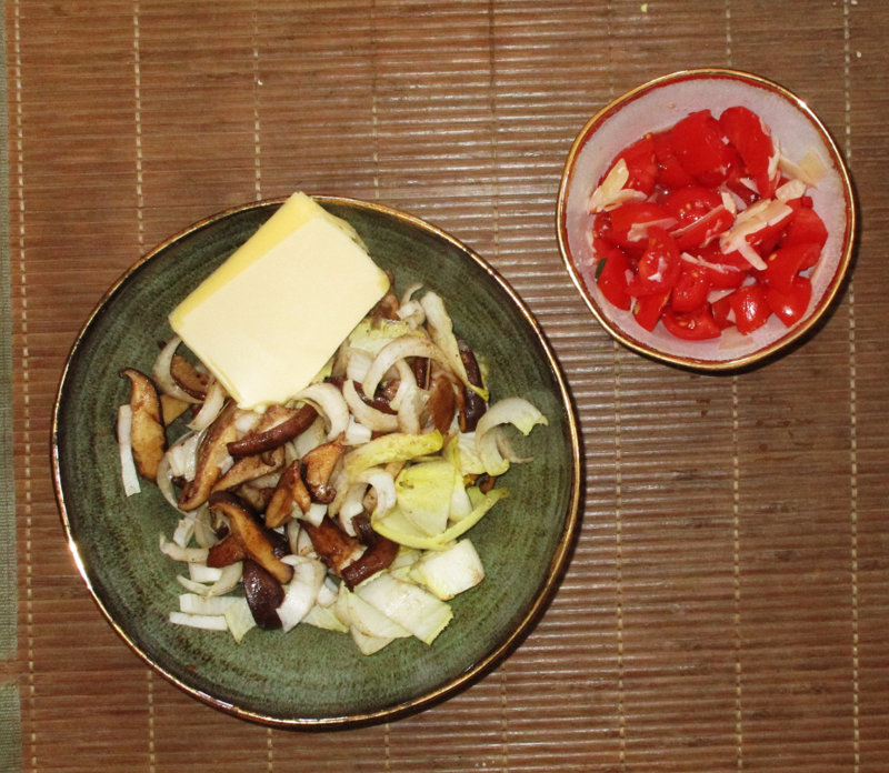 Shitake & Chicoree ... Tomato, Chili, Greek Salt ... my lunch today